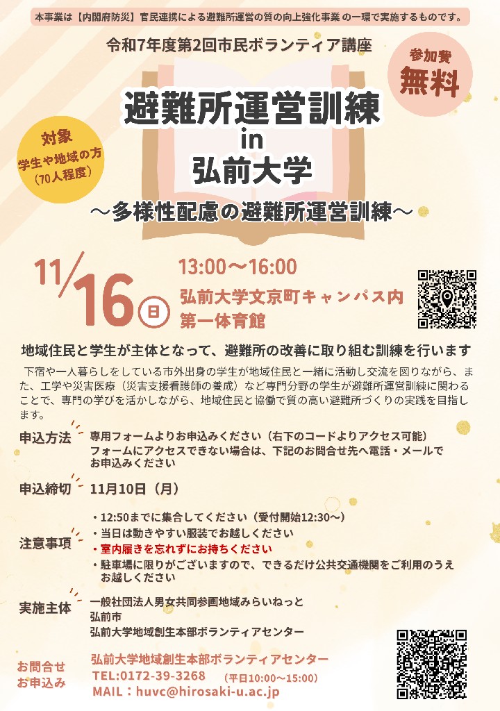 弘前大学ボランティアセンターでは、一般社団法人男女共同参画地域みらいねっとと共催で「避難所運営訓練in弘前大学」を開催いたします。