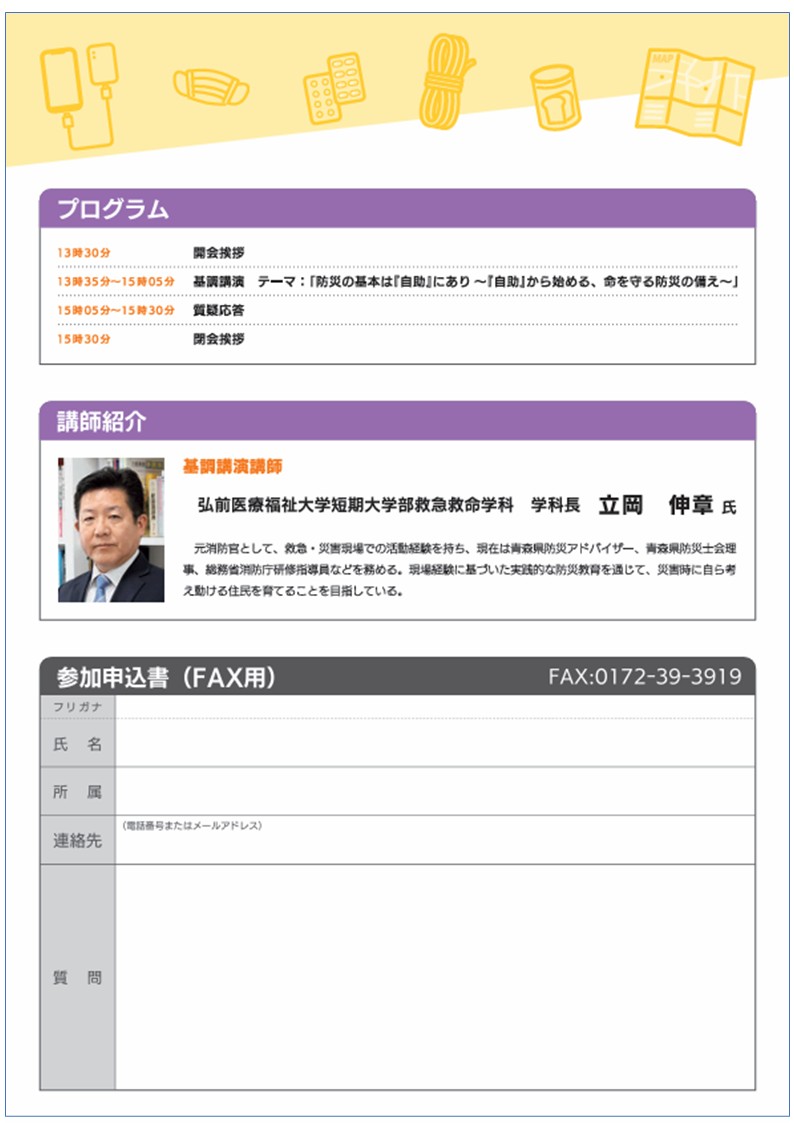 本シンポジウムでは、実践的な防災の備えについて、専門家である弘前医療福祉大学短期大学部救急救命学科 学科長の立岡伸章氏から講演いただきます。また、防災に対する正しい備えについて学ぶとともに、参加者および配信視聴者参加型のワークを通して、市民の防災力を高める機会といたします。