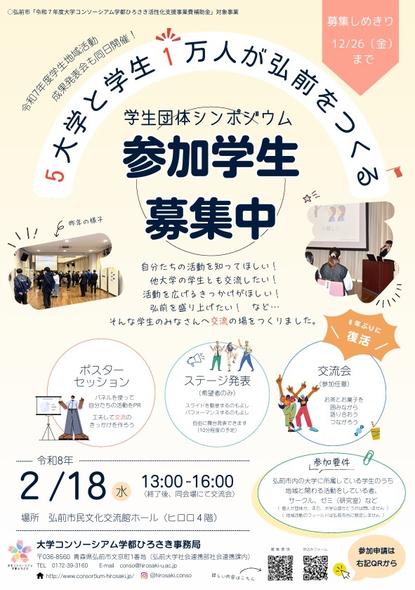 本イベントは、学生の活動を広く公開することで、学生が弘前市を盛り上げている現状を多くの市民が知ることのほか、