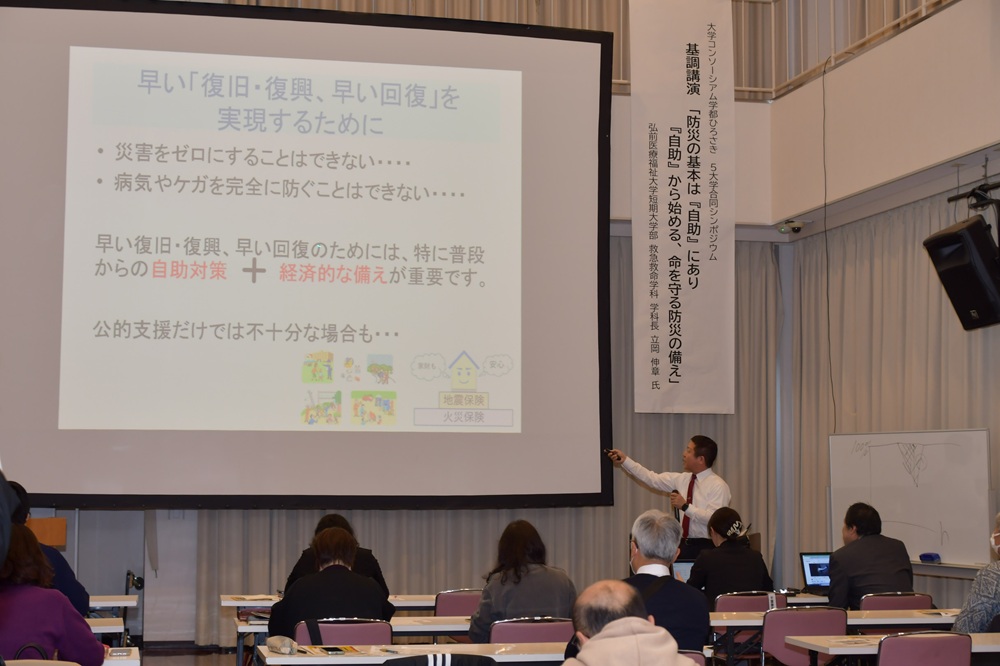 弘前大学を含む青森県弘前市内の5大学で構成している「大学コンソーシアム学都ひろさき」では、令和7年12月14日(日)に、5大学合同シンポジウム「防災の基本は『自助』にあり ~『自助』から始める、命を守る防災の備え~」を土手町コミュニティパーク(青森県弘前市土手町)で開催しました。
