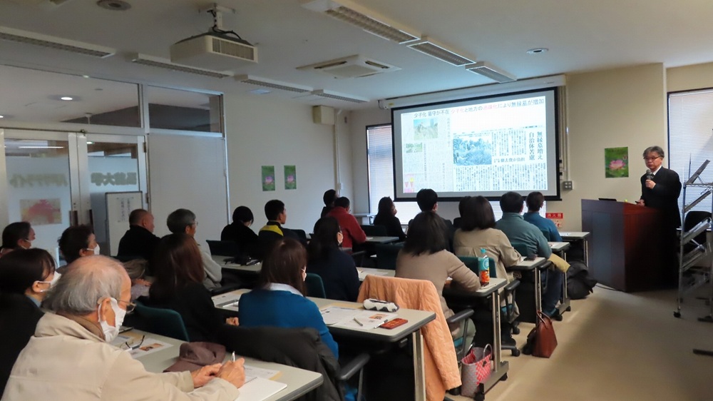 はじめに、「お墓は死を概念化できた人類だけが作る極めて人間的な営みであり、人は故人を偲び、お墓を営むことで死を受け入れてきた。お墓を見るとその時代がどのような社会だったのかを考えることができる。お墓は現世の映し鏡であり、現代日本のお墓は、墓じまい・海洋散骨・樹木葬・合葬墓など多様化している。」というお話がありました。