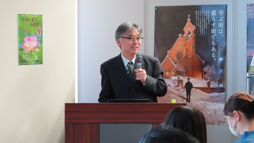 本セミナーは、地域へ本学の教育・研究成果を広く社会還元し、地域課題解決に資することを目的に、お墓と墓石の歴史を振り返ることで、お墓のあり方について共に考える内容となっています。講師に、弘前大学人文社会科学部 関根 達人 教授を招き、お墓にまつわる歴史研究をベースに講演していただきました。
