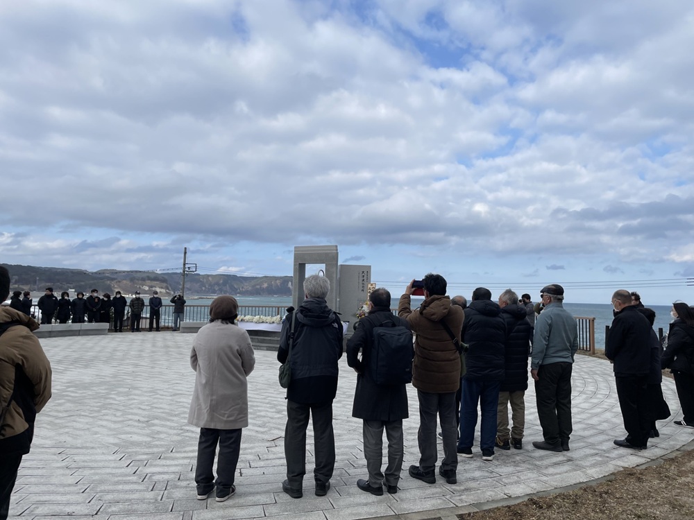 ミーティング後は、海岸沿いに設置された大津波記念碑の前で行われる東日本大震災追悼行事に参列しました。会場では、地震発生時刻の14時46分にサイレンが鳴り、参加者による黙とうが行われました。