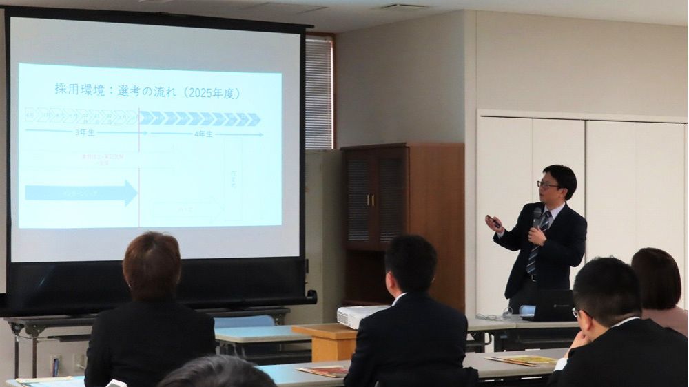 続いて、学務部就職支援室 板垣 学 係長より、「大学キャリアセンターの取組と学生の傾向」について情報の提供がありました。大学におけるキャリア教育や就職相談などの取り組み、就職活動環境の変化による学生の意識の二極化、就職先選択にあたっての動向、学生へのアプローチ方法について説明がありました。