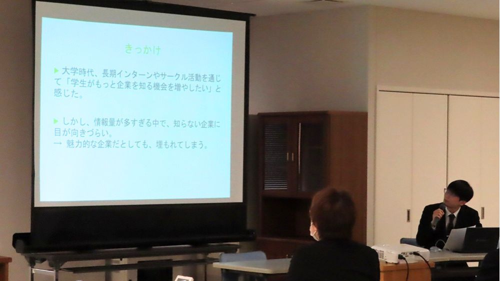 さらに、弘前大学卒業生である株式会社アンカリンク 代表取締役 安部 真之介 氏より、「就職サイトを運営してわかったこと」について、自ら得られた知見についてご講演いただきました。本学生の県内就職状況を踏まえ、学生の視点から県内企業が取り組むべき対策について具体的にご提案いただきました。